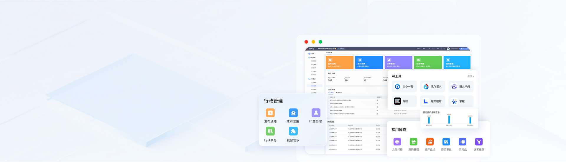 行政管理系統(tǒng)涵蓋信息發(fā)布、政策導(dǎo)航、行政事務(wù)、資產(chǎn)管理、運(yùn)營分析等功能,同時(shí)推出智能印章、視頻管家等智能硬件,軟硬件結(jié)合,提升企業(yè)管理效率、為企業(yè)實(shí)現(xiàn)降本增效。